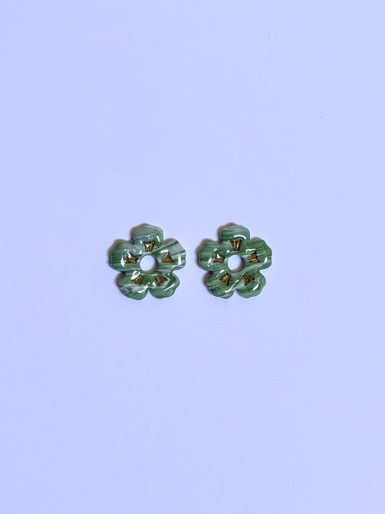 Une paire de Pampilles Ella de 20 mm en pâte polymère et recouverte légèrement de résine (dégradée vert - doré)