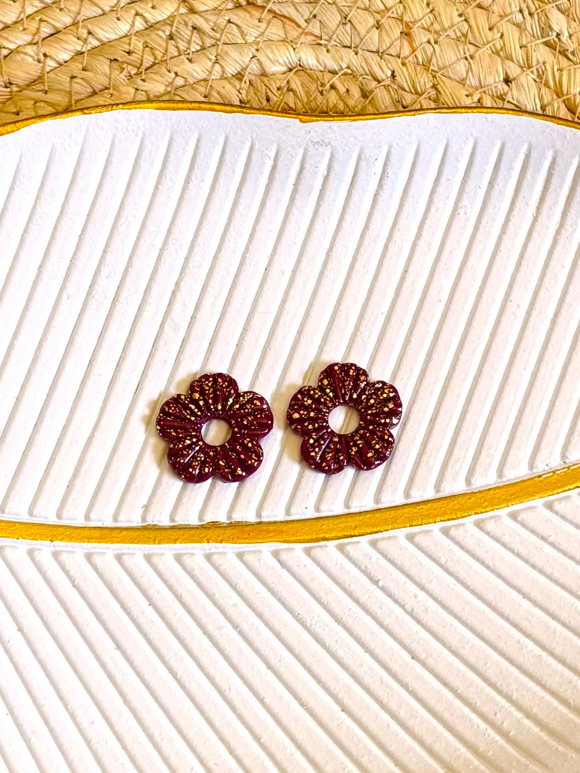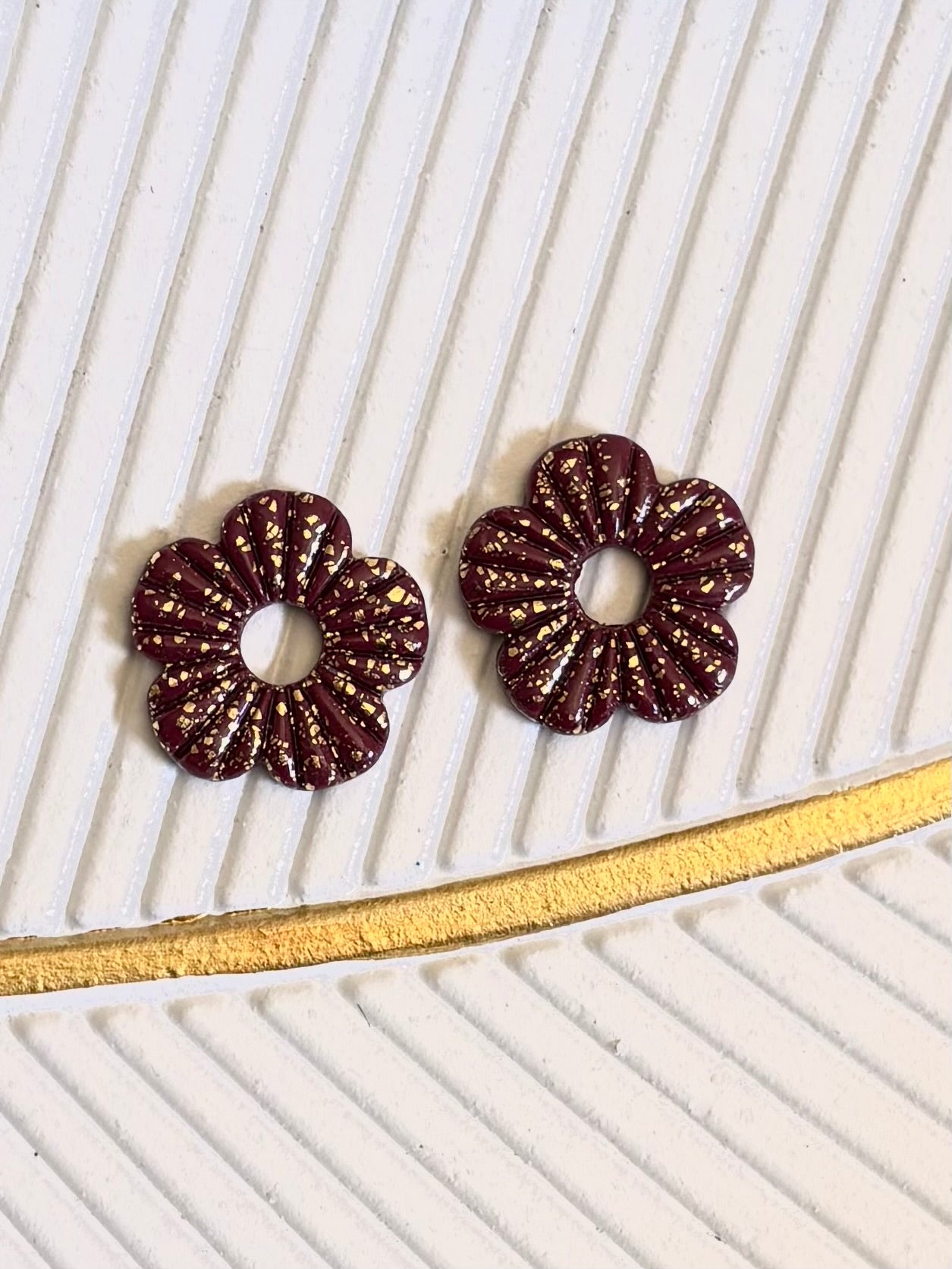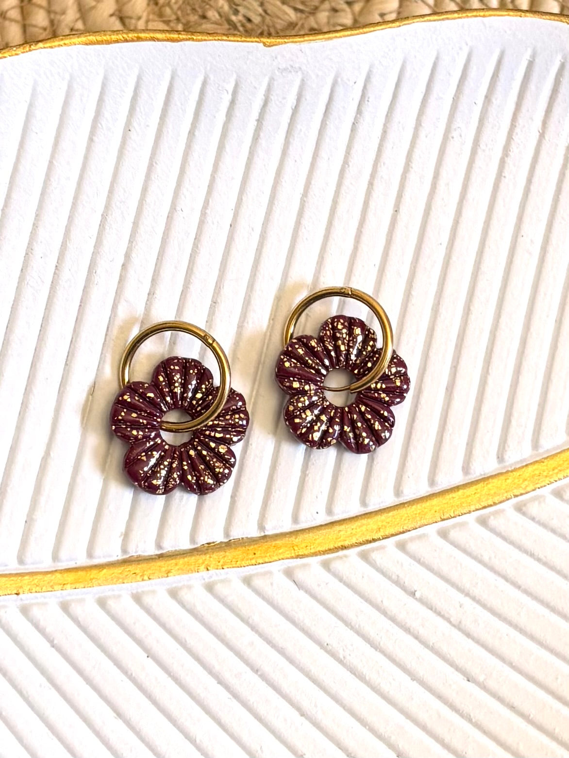Une paire de Sara de 25 mm de couleur bordeaux, avec un ajout de fines feuilles d’or pour une touche élégante et lumineuse.