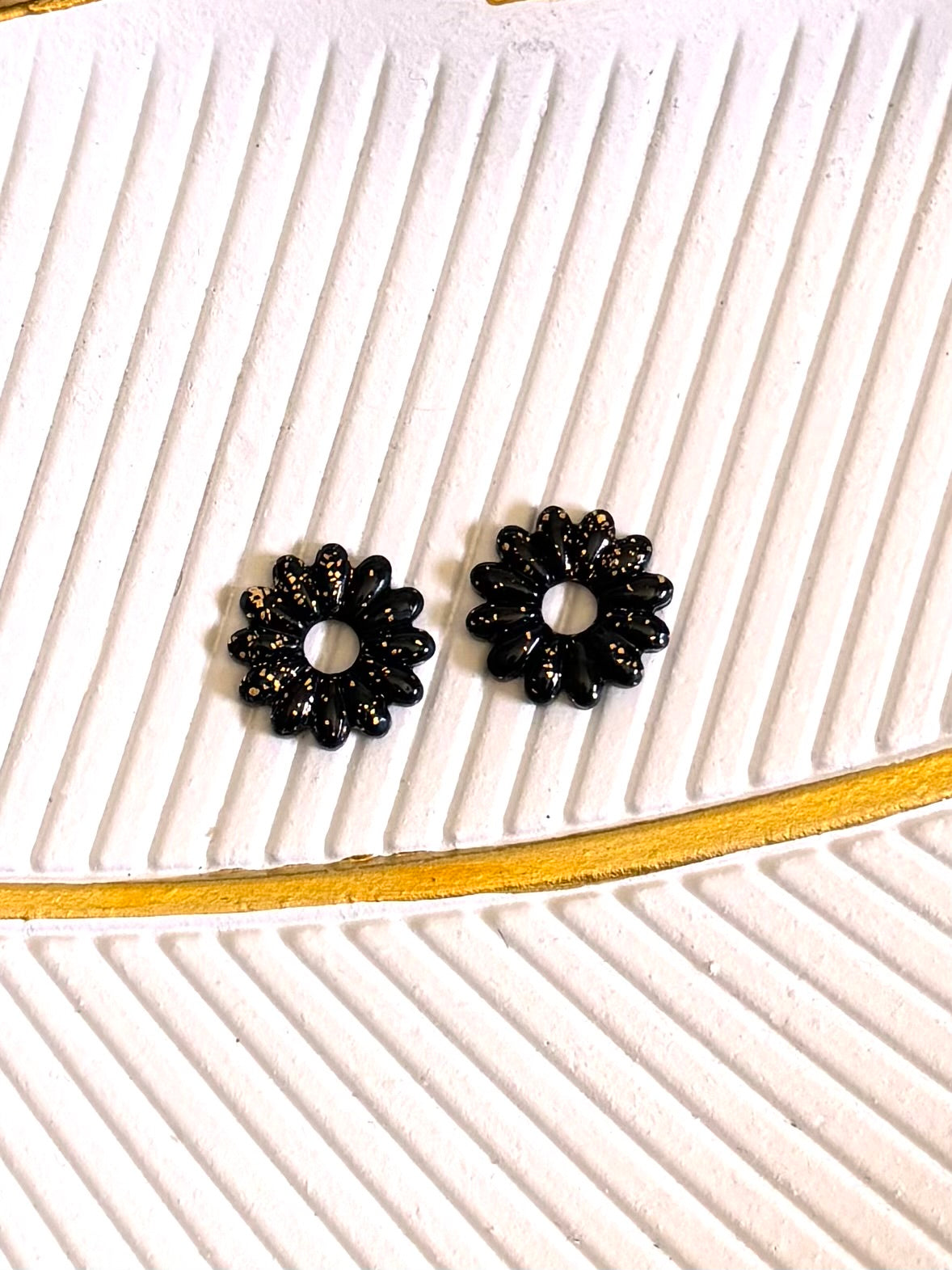 Une paire de Ti Marguerite de 20 mm de couleur noir, avec un ajout de fines feuilles d’or pour une touche élégante et lumineuse.